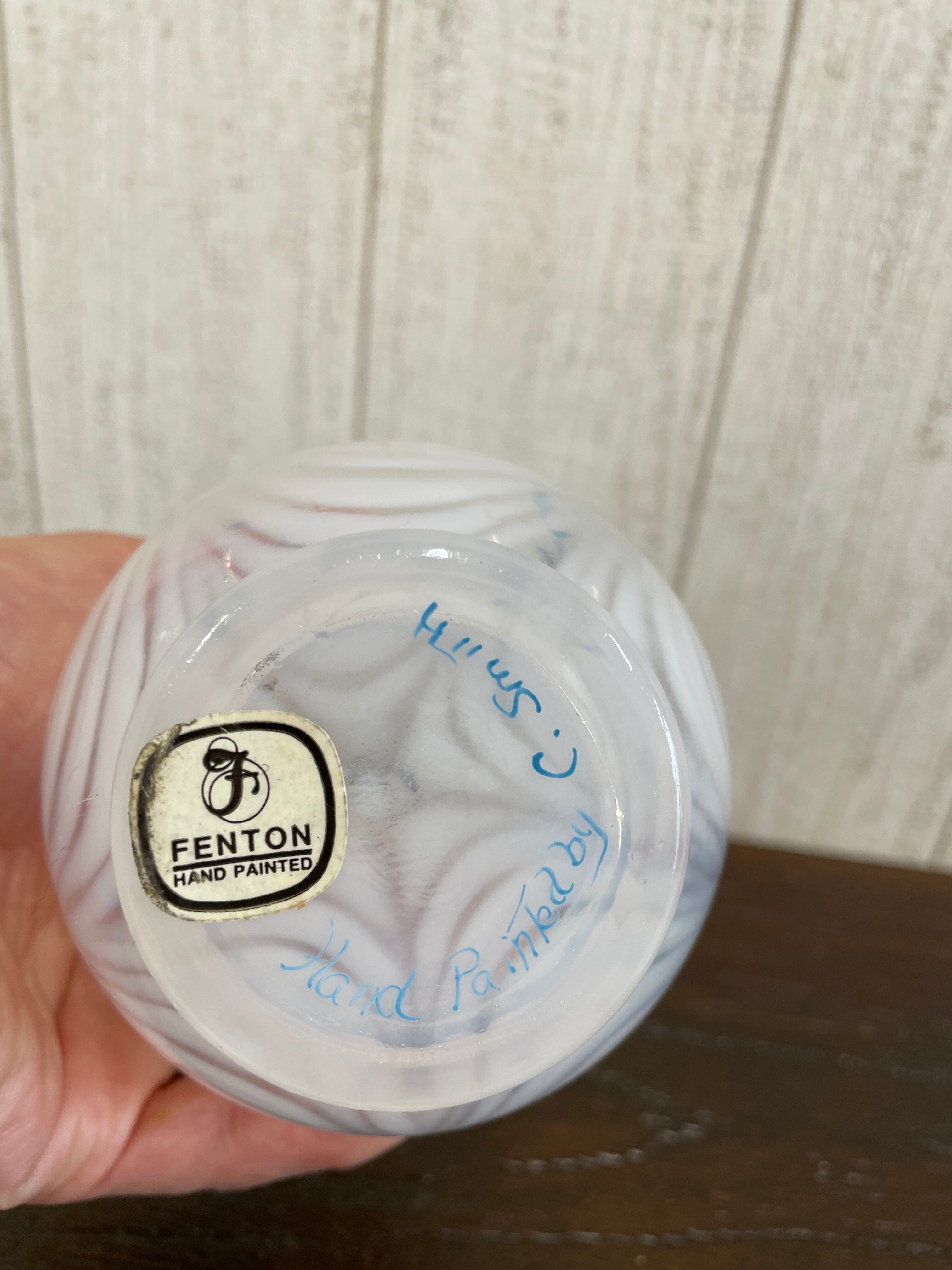 Vintage Fenton ハンドペイント花瓶。底裏面にはアーティストのサイン有り。Fentonシール付き。